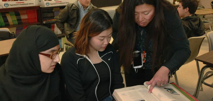 Seventeen-year-old Rozina Ahsan with teacher Sunny Deitrick. After three years of study, Rozina learned English and exited the English Language Acquisition program last year. She is now an ESOL student aide.