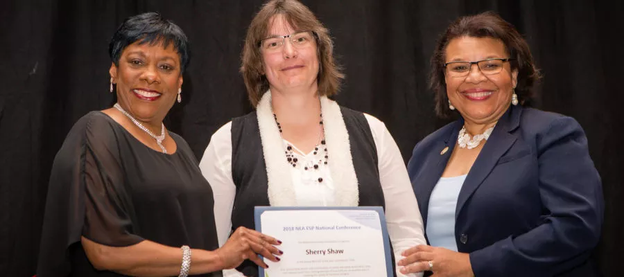 NEA Vice-President Becky Pringle (left) and NEA Secretary-Treasurer Princess Moss (right) with 2018 ESP of the Year Sherry Shaw