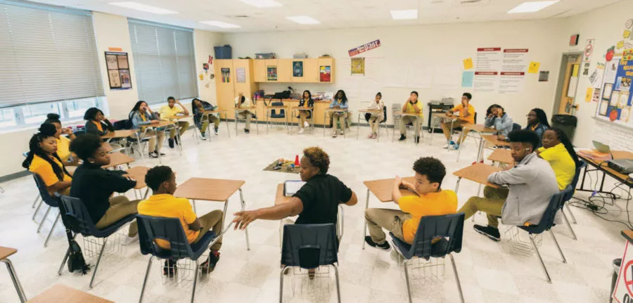 Classroom circles are just one of the restorative practices that Dora Moore’s educators have adopted over recent years. Many of their students also practice their conflict-resolution skills in “peace walks,” and get regular, positive feedback through daily, one-on-one check-ins with dedicated, full-time restorative practices specialists on their campuses.