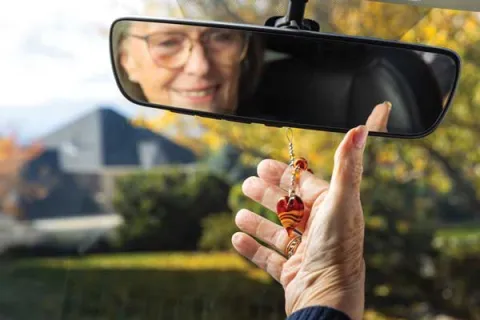 She has a glass pendant that a student gave her around the time she retired. She hangs it on the rearview mirror of her car, because it reminds her of all the students she has taught.