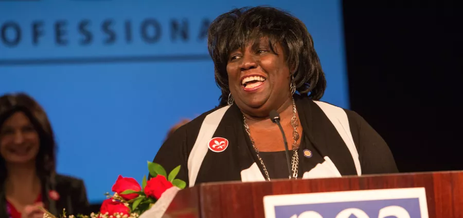 A decorated leader and activist with the California Teachers Association (CTA) and United Educators of San Francisco (UESF), Eberhardt reached another career milestone Friday night at the National Education Association (NEA) Education Support Professionals Conference in New Orleans when she was named the 2015 NEA ESP of the Year.