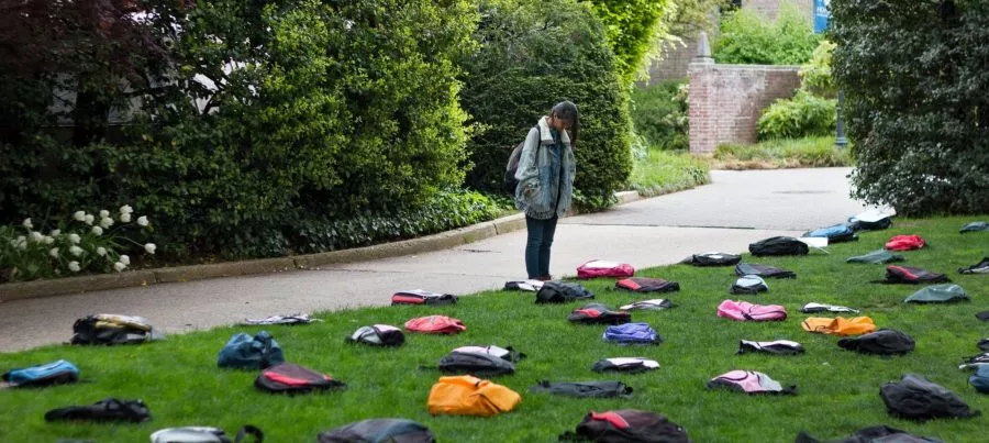 The non-profit organization Active Minds, which raises awareness of mental health, offers a traveling exhibit of 1,100 empty backpacks to college campuses. The exhibit, called “Send Silence Packing,” illustrates the 1,100 college students who die by suicide each year. (Photo: ActiveMinds.org)