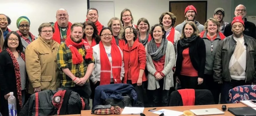 Bargaining team members of the St. Paul Federation of Teachers assemble after negotiating their contract.