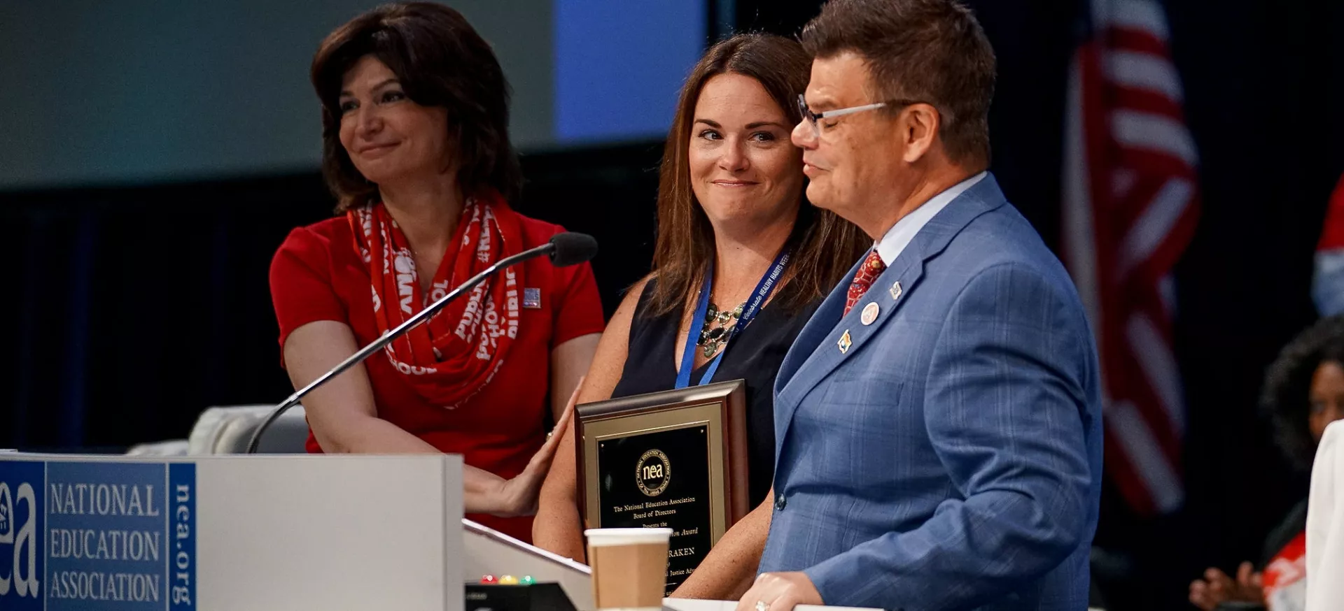 Kristin Ellenberger (center) and PSEA President Rich Askey accept the Friends of Education Award from NEA President Lily Eskelsen García during the 2019 NEA Representative Assembly.