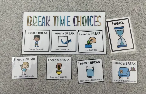 “A student will say, hey I need to play a break card, and they have cards for coloring breaks, quiet corner breaks, water breaks, and bathroom breaks,” Guerrero explains. “They get to choose the break category, and it helps prevent meltdowns and allows them to better focus after the break.”