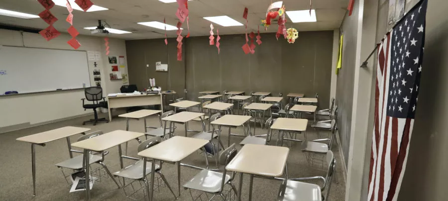 An empty world language room at Orange High School, Thursday, March 12, 2020, in Pepper Pike, Ohio. (AP Photo/Tony Dejak)