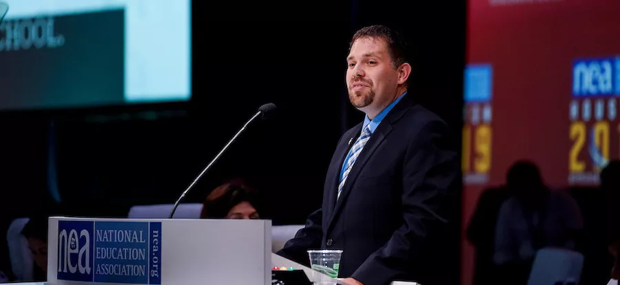 Taking this seat at the table (and keeping it) is a goal shared by all school teachers and education support professionals, said 2019 NEA ESP of the Year Matthew Powell. Powell, a custodial supervisor in Kentucky and one of the most politically active educators in the state, addressed the RA on July 5.