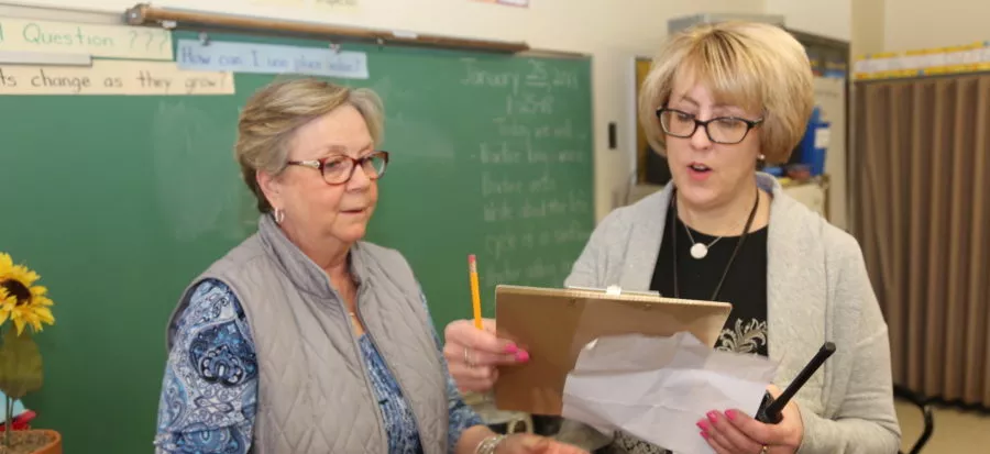 Nurse Sheryl Lapp (right) often meets with staff members like teacher Sandy Doyon to coordinate students’ health care needs.