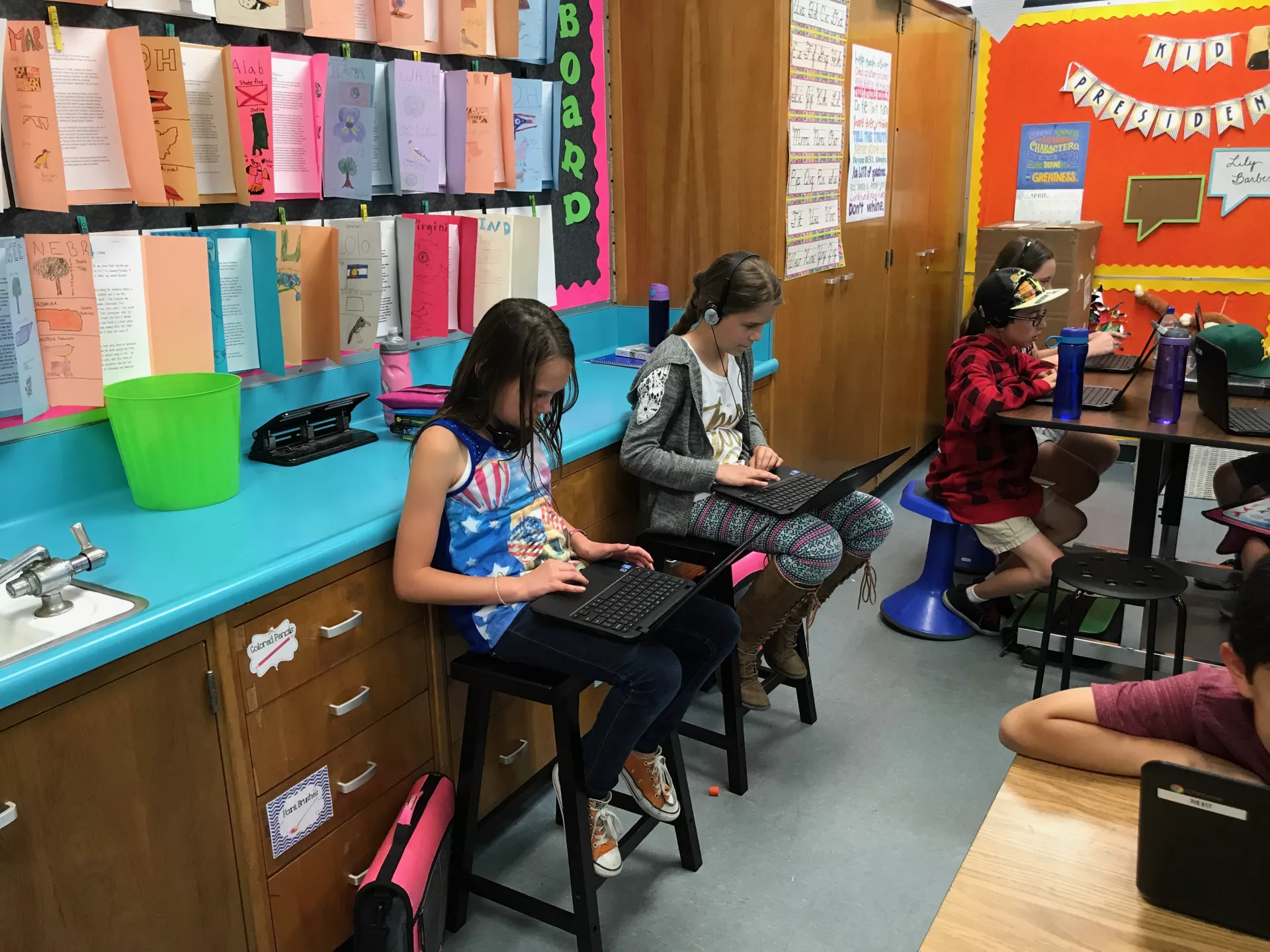 She has always allowed students to move around, as she does herself when she is employing QR codes, Apple TV and a smartboard. “My kids have desks, but they can move their chairs around. Much of the time, they sit on the floor,” she says. Instead of prohibiting cellphones, Toll encourages students to use them in their assignments, along with Chromebooks. “Some kids can actually write essays on their phones. I see them pounding away on them,” she says.