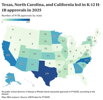 Texas, North Carolina, and California public school districts employ the most educators holding H-1B visas, while Georgia, Alaska, Arizona, and Minnesota all also employ over 100 educators.